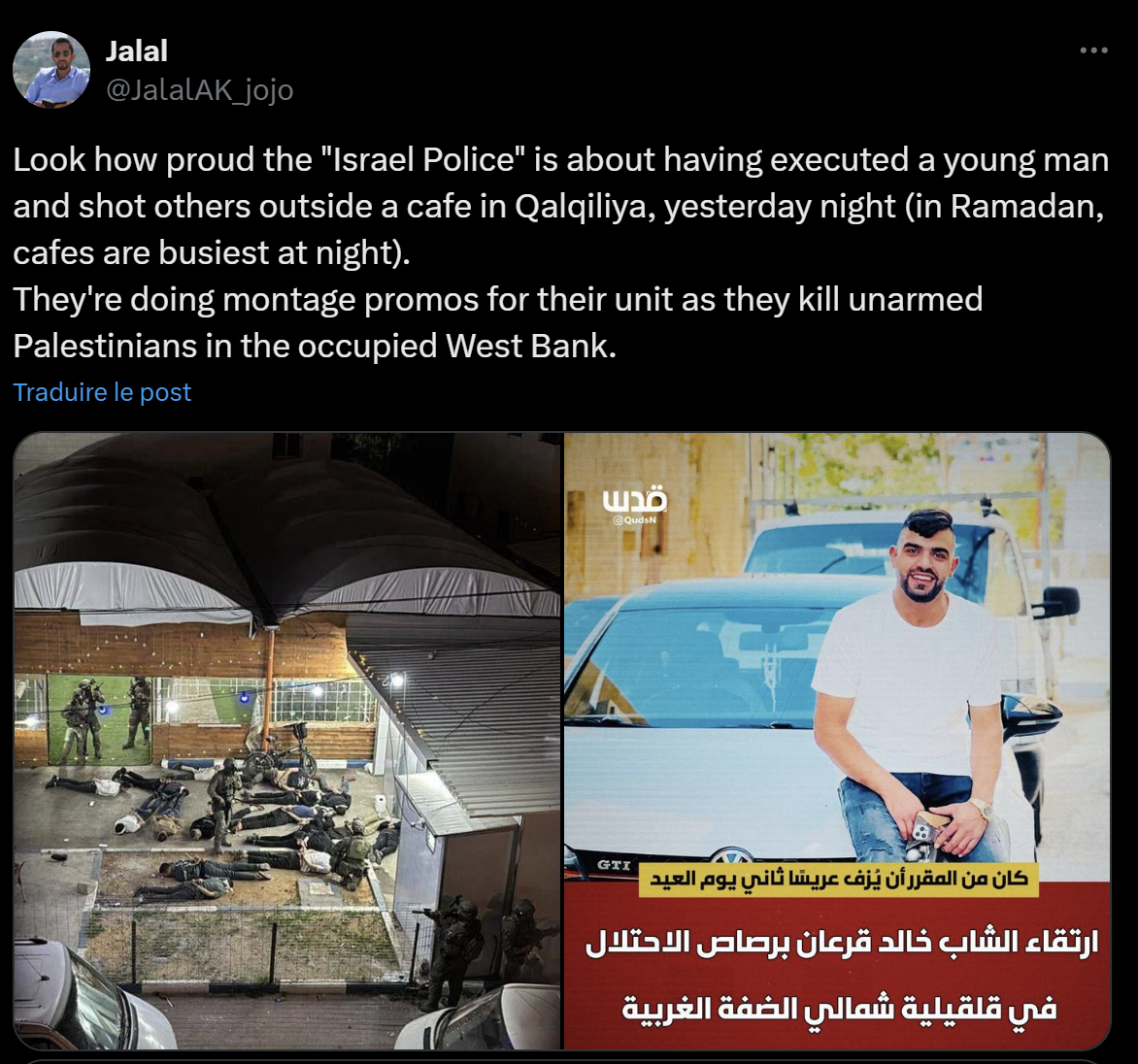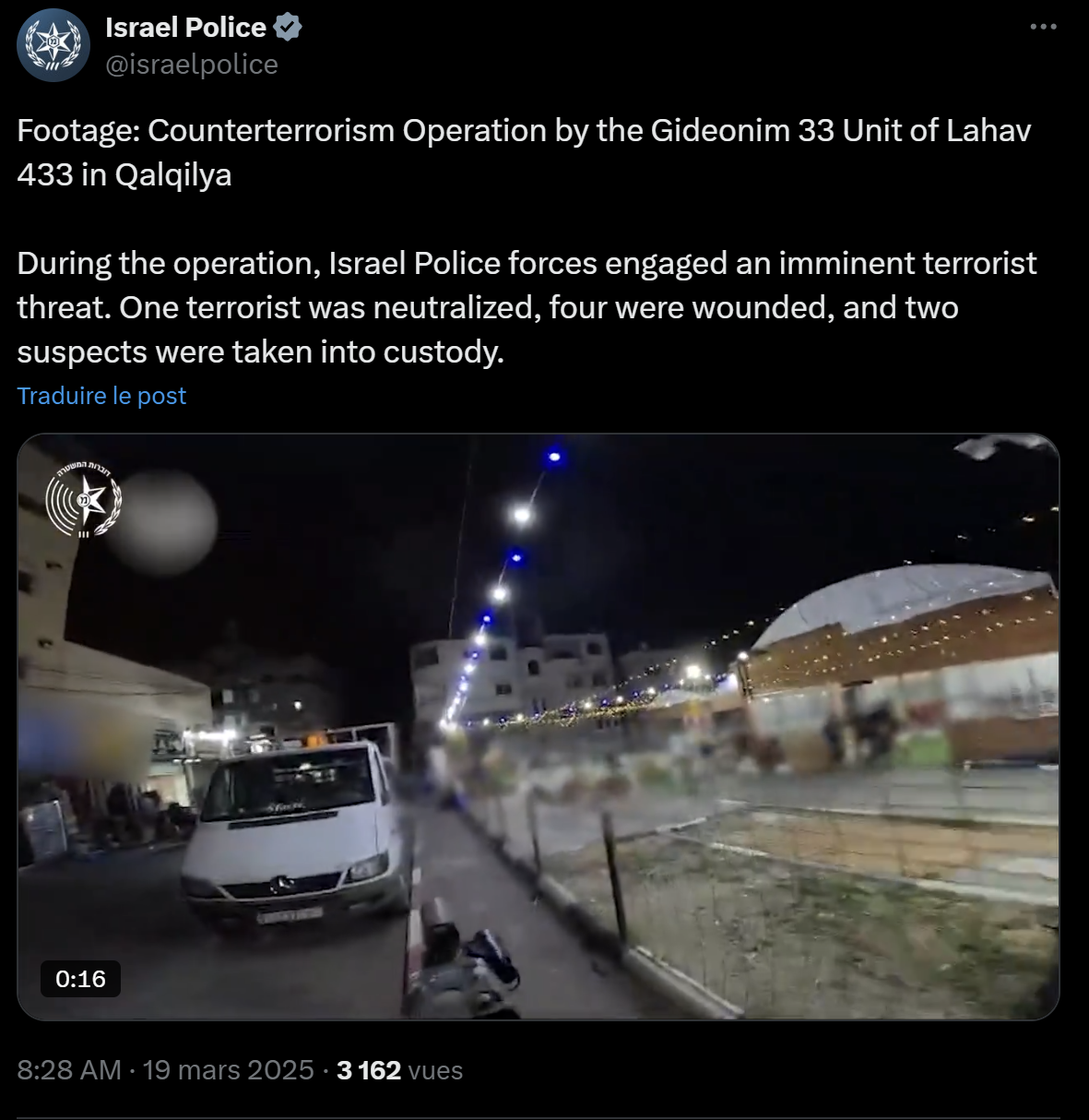 According to Israeli Police X account : "Counterterrorism Operation by the Gideonim 33 Unit of Lahav 433 in Qalqilya. During the operation, Israel Police forces engaged an imminent terrorist threat. One terrorist was neutralized, four were wounded, and two suspects were taken into custody."