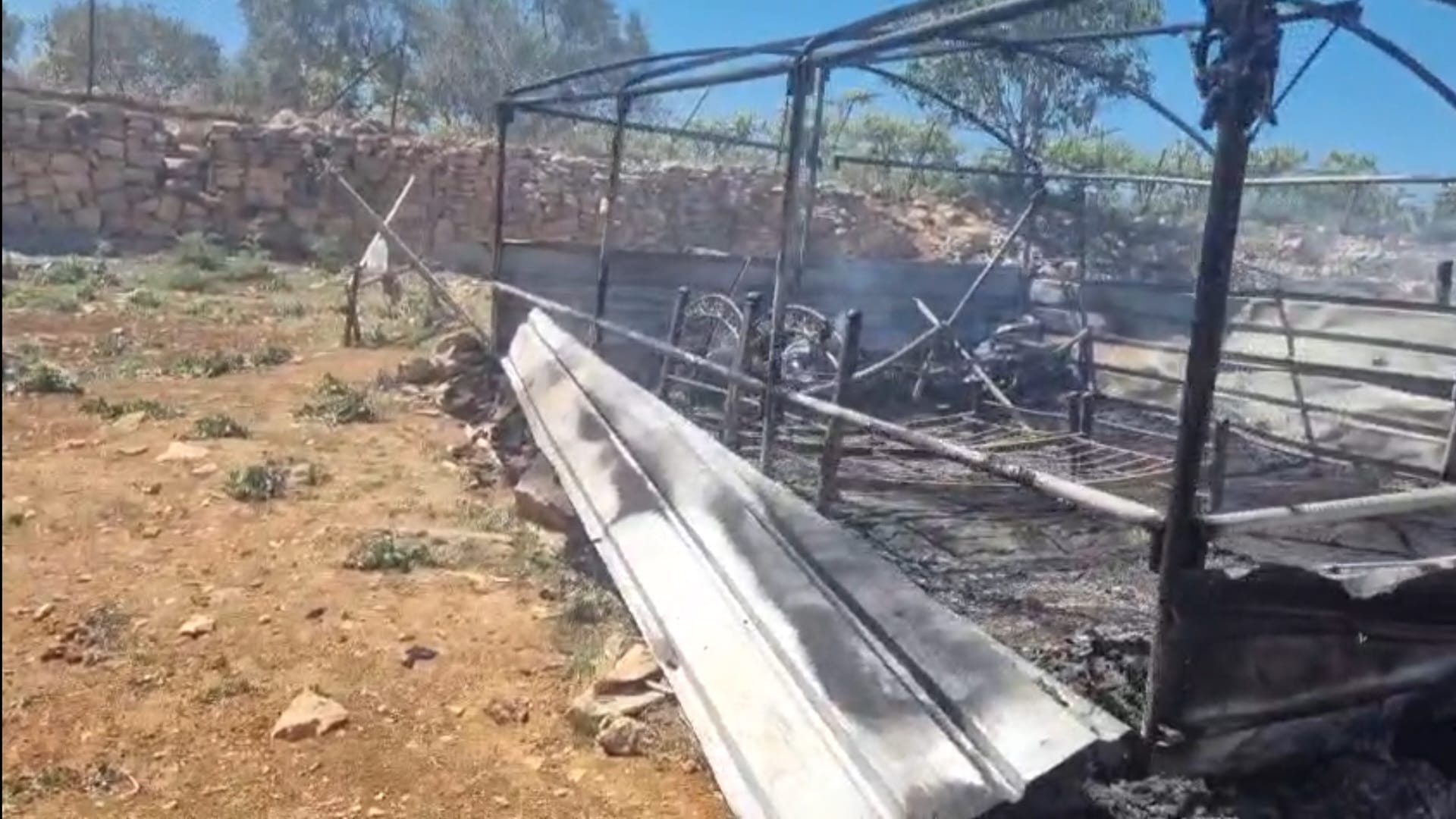 Noon: Settlers torch Bedouin tents, steal sheep. Attack and pepper-spray 68-year-old Muhammad ‘Ara’rah. Burn Wael Ghafri’s brother’s farming shed and other property.