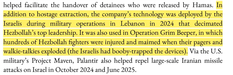 Steinberger writes that Palantir’s AI-driven software was used in multiple Israeli military raids in Gaza, as well as in 2024 operations in Lebanon that severely damaged Hezbollah’s leadership. The technology was also employed in Operation Grim Beeper, in which booby-trapped communication devices caused mass injuries among Hezbollah fighters.