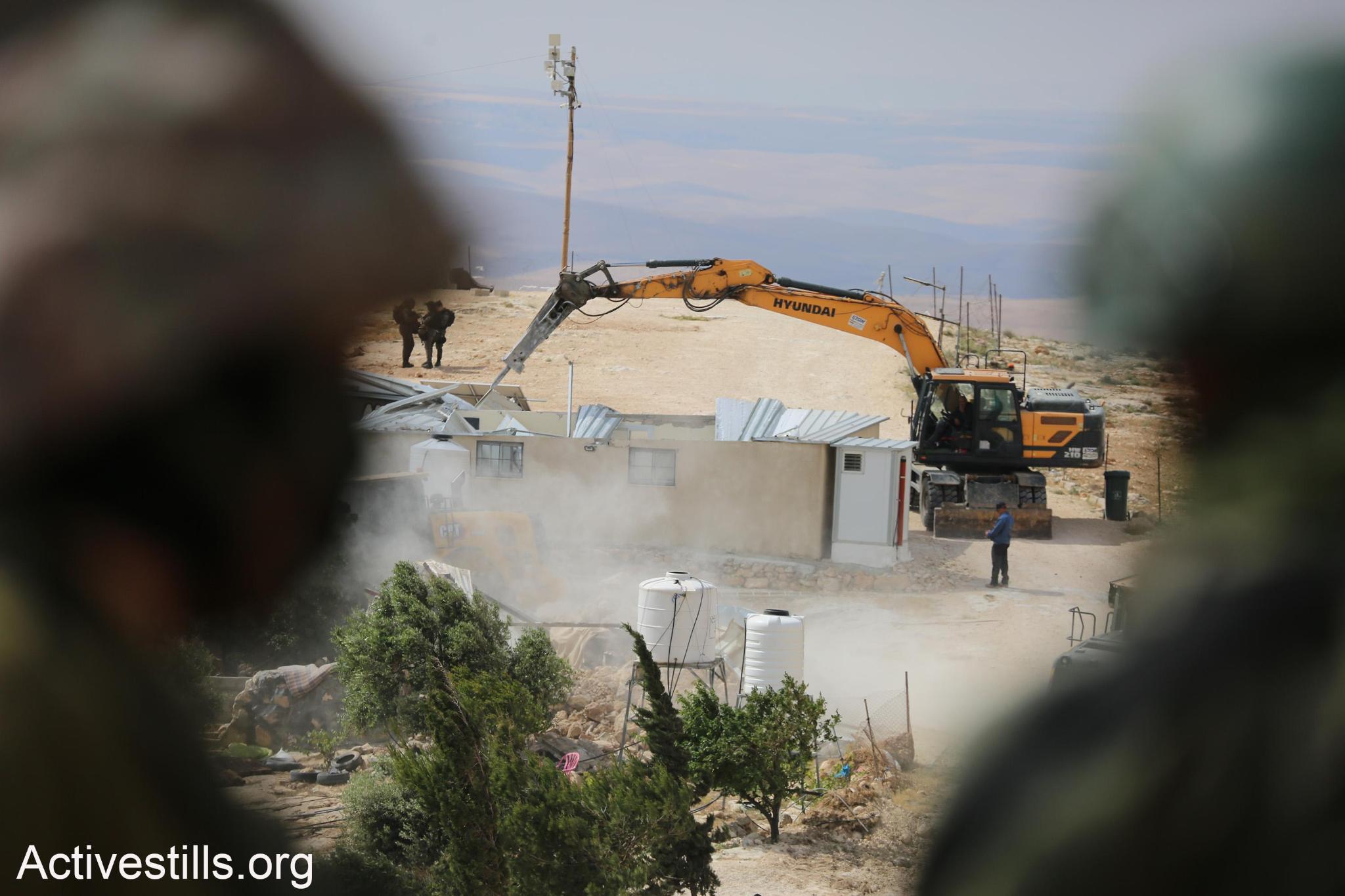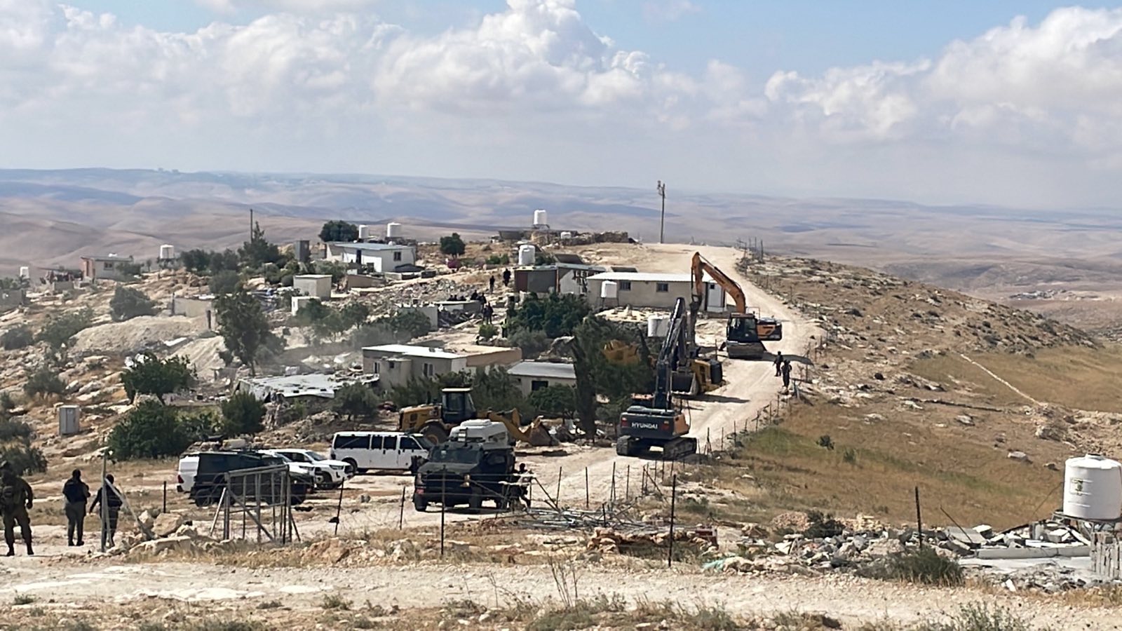 They demolished 9 homes, 6 caves, 10 water tanks, 4 animal barns, 11 toilet rooms, 7 water wells, 400 meters of agricultural fencing, the community center, the electricity room, all solar panels, internet systems, and security cameras. Only 2 or 3 houses remain standing.