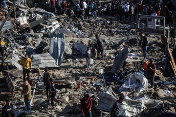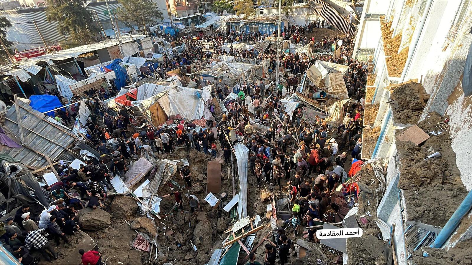 Around 6 pm, a double Israeli airstrike targeted the Abu Hamisa South School in Al-Bureij refugee camp in Central Gaza, killing around 20 people and destorying displacement tents in the courtyard.