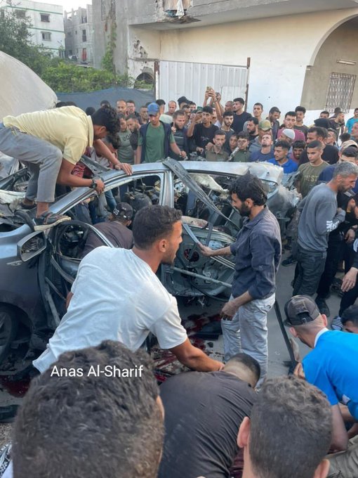 Around 7 pm, an Israeli airstrike targeetd a car on Al-Nafaq Street in Gaza City, killing four young men including journalist Moataz Rajab and humanitarian relief manager Muhammad Al-Mubayad