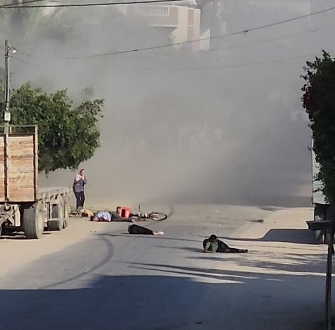 Around 5:30 pm, an Israeli drone struck a man riding a bicycle on Street 17 west of Deir al-Balah. As people tried to go to his rescue, Israeli troops targeted them also, leading to the murder of sux people in total.