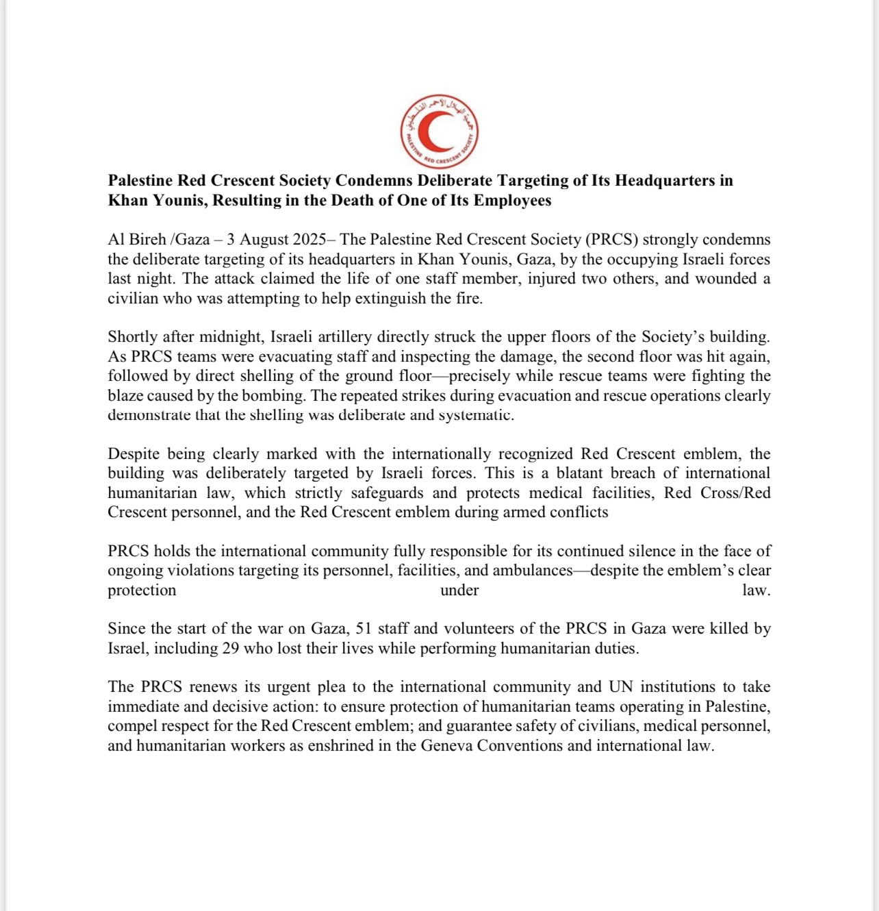On the afternoon of August 6, Israeli artillery shelled the 8th floor of the PRCS headquarters.