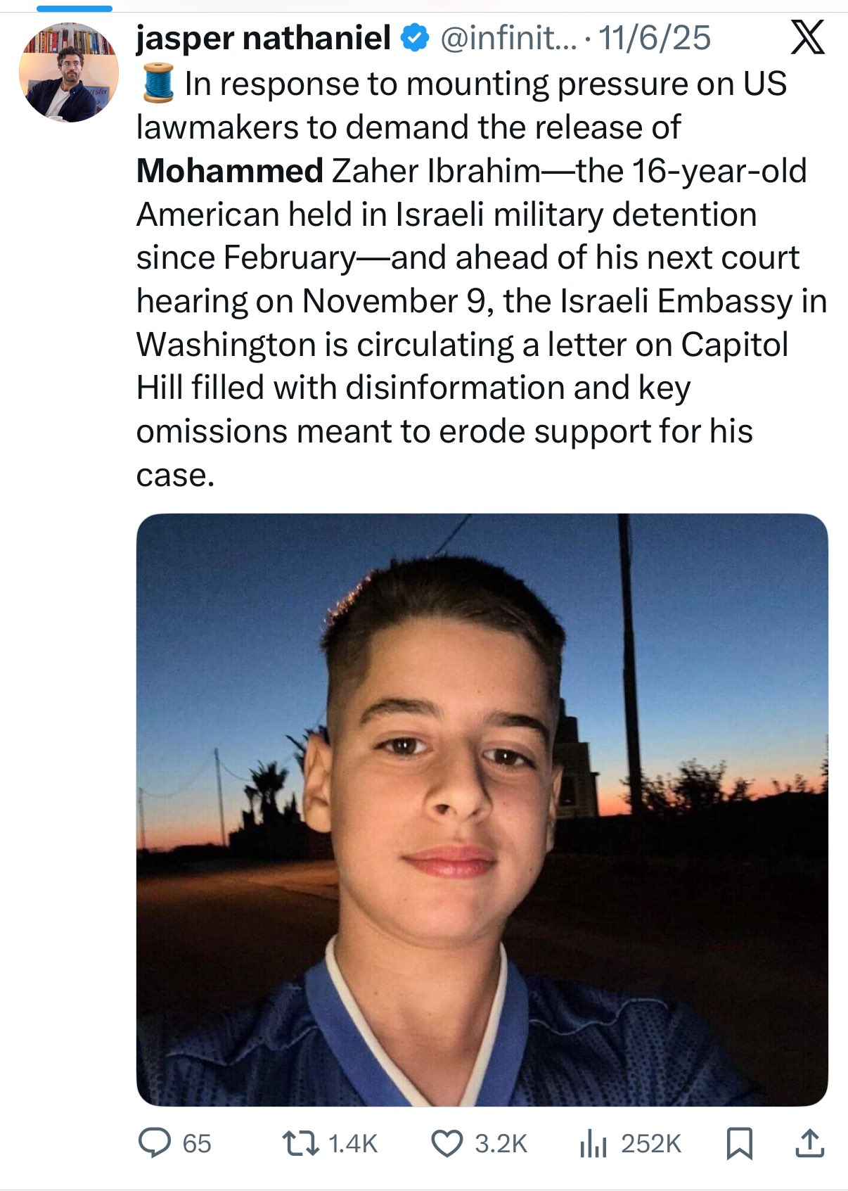 Mohammad Zaher Taysir Ibrahim, a 15-year-old Palestinian-American boy from Florida, has been illegally imprisoned by the Israeli occupation after being abducted at his family home in Al‑Mazra’a ash‑Sharqiya, near Ramallah, near Silwad on February 15, 2025. He is detained in Israel's Megiddo prison since February, accused without evidence of throwing a rock on an empty street, a charge routinely used to criminalize Palestinian youth. He’s endured inhumane conditions, lost over 25 pounds, and contracted scabies. His health has severely decline and his family fears for his life, as other prisoners have died from torture, disease, and starvation. Despite their pleas, major U.S. media outlets have ignored the case.