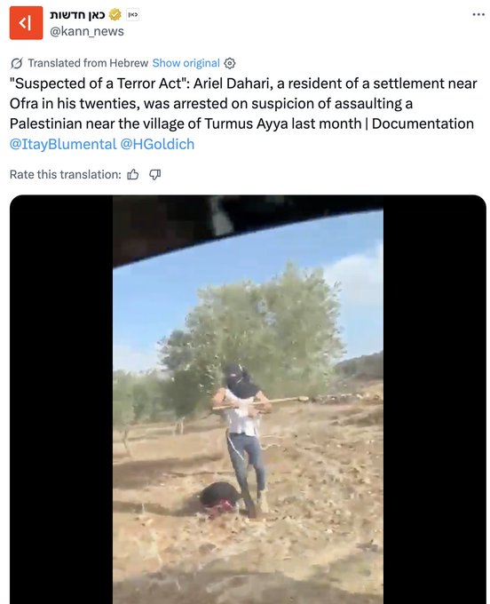 On November 9, Israeli channel Kan publish under the titel "Suspected of a terrorist act" that Ariel Dahari, a resident of a hill near Ofra in his twenties, was arrested on suspicion of attacking a Palestinian woman (Um Saleh) near the village of Turmus Ayya. According to Jasper Nathaniel, a quick Google search shows he’s been investigated for violence before.