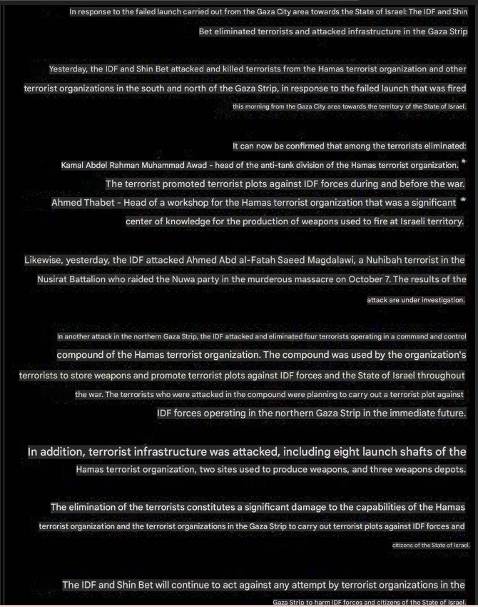 "In response to the failed launch carried out from the Gaza City area towards the State of Israel: The IDF and Shin Bet eliminated terrorists and attacked infrastructure in the Gaza Strip. Yesterday, the IDF and Shin Bet attacked and killed terrorists from the Hamas terrorist organization and other terrorist organizations in the south and north of the Gaza Strip, in response to the failed launch that was fired this morning from the Gaza City area towards the territory of the State of Israel. It can now be confirmed that among the terrorists eliminated: Kamal Abdel Rahman Muhammad Awad - head of the anti-tank division of the Hamas terrorist organization. The terrorist promoted terrorist plots against IDF forces during and before the war. Ahmed Thabet - Head of a workshop for the Hamas terrorist organization that was a significant center of knowledge for the production of weapons used to fire at Israeli territory. Likewise, yesterday, the IDF attacked Ahmed Abd al-Fatah Saeed Magdalawi, a Nuhibah terrorist in the Nusirat Battalion who raided the Nuwa party in the murderous massacre on October 7. The results of the attack are under investigation. In another attack in the northern Gaza Strip, the IDF attacked and eliminated four terrorists operating in a command and control compound of the Hamas terrorist organization. The compound was used by the organization's terrorists to store weapons and promote terrorist plots against IDF forces and the State of Israel throughout the war. The terrorists who were attacked in the compound were planning to carry out a terrorist plot against IDF forces operating in the northern Gaza Strip in the immediate future. In addition, terrorist infrastructure was attacked, including eight launch shafts of the Hamas terrorist organization, two sites used to produce weapons, and three weapons depots. The elimination of the terrorists constitutes a significant damage to the capabilities of the Hamas terrorist organization and the terrorist organizations in the Gaza Strip to carry out terrorist plots against IDF forces and citizens of the State of Israel. The IDF and Shin Bet will continue to act against any attempt by terrorist organizations in the Gaza Strip to harm IDF forces and citizens of the State of Israel."