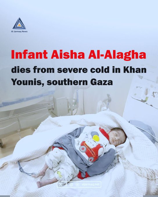 Infant Aisha Al-Alagha, 27 days old, has died of severe cold in Khan Younis City, southern Gaza Strip.