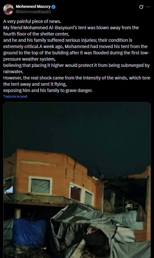 "A very painful piece of news. My friend Mohammed Al-Basyouni’s tent was blown away from the fourth floor of the shelter center, and he and his family suffered serious injuries; their condition is extremely critical.A week ago, Mohammed had moved his tent from the ground to the top of the building after it was flooded during the first low-pressure weather system, believing that placing it higher would protect it from being submerged by rainwater. However, the real shock came from the intensity of the winds, which tore the tent away and sent it flying, exposing him and his family to grave danger."