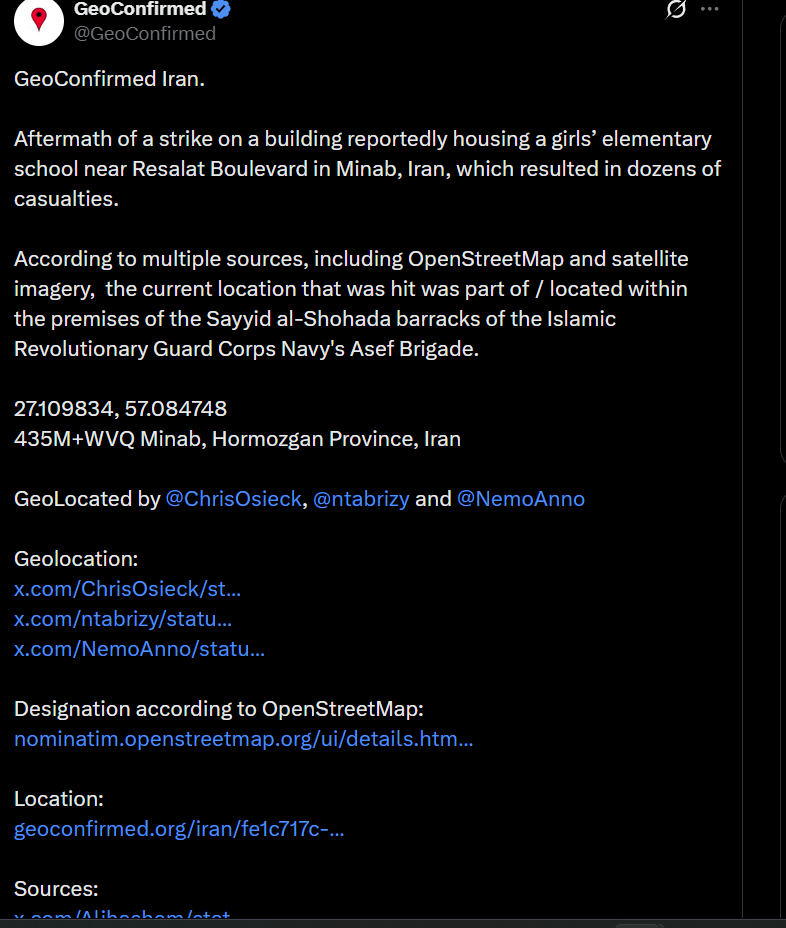 Some pro-Israeli accounts claimed the site was part of an IRGC military base, but critical contradiction highlighted that the missiles hit the military base, and the school, but avoided a civilian clinic located between them that opened in 2025. This suggests attackers had accurate, updated targeting information, raising questions about Serious intelligence failure, or deliberate targeting of the school.