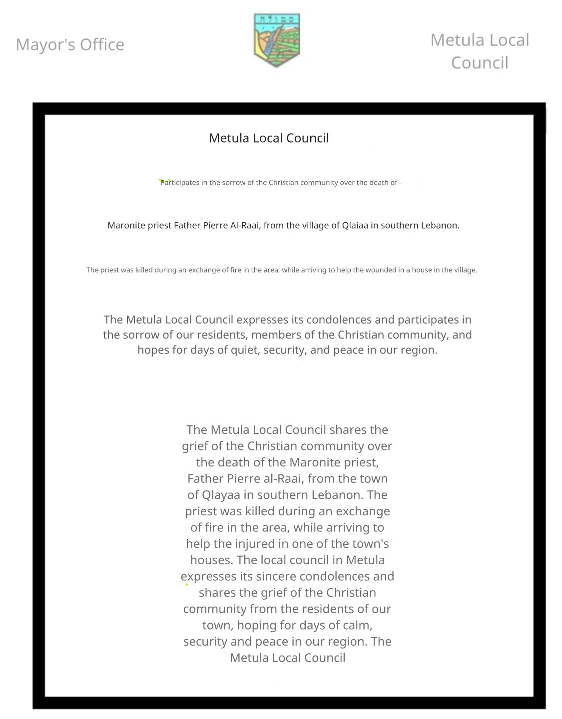 Israeli Activist B.M. reports: "The audacity: Four days after talking on Israeli radio about the need to "destroy and wipe out" South Lebanon, the head of Metula settlement, David Azulay, issues a statement of condolences, in Hebrew and Arabic, for Pierre al-Rahi, the Lebanese priest who was murdered by Israel on Monday. The village of Al-Qlayaa, where al-Rahi was murdered, is located 5 kilometers from Metula. Some Lebanese Christians originally from Al-Qlayaa, who used to be part of Israel's pre-2000 collaborator militia, the South Lebanon Army, now reside in Metula."