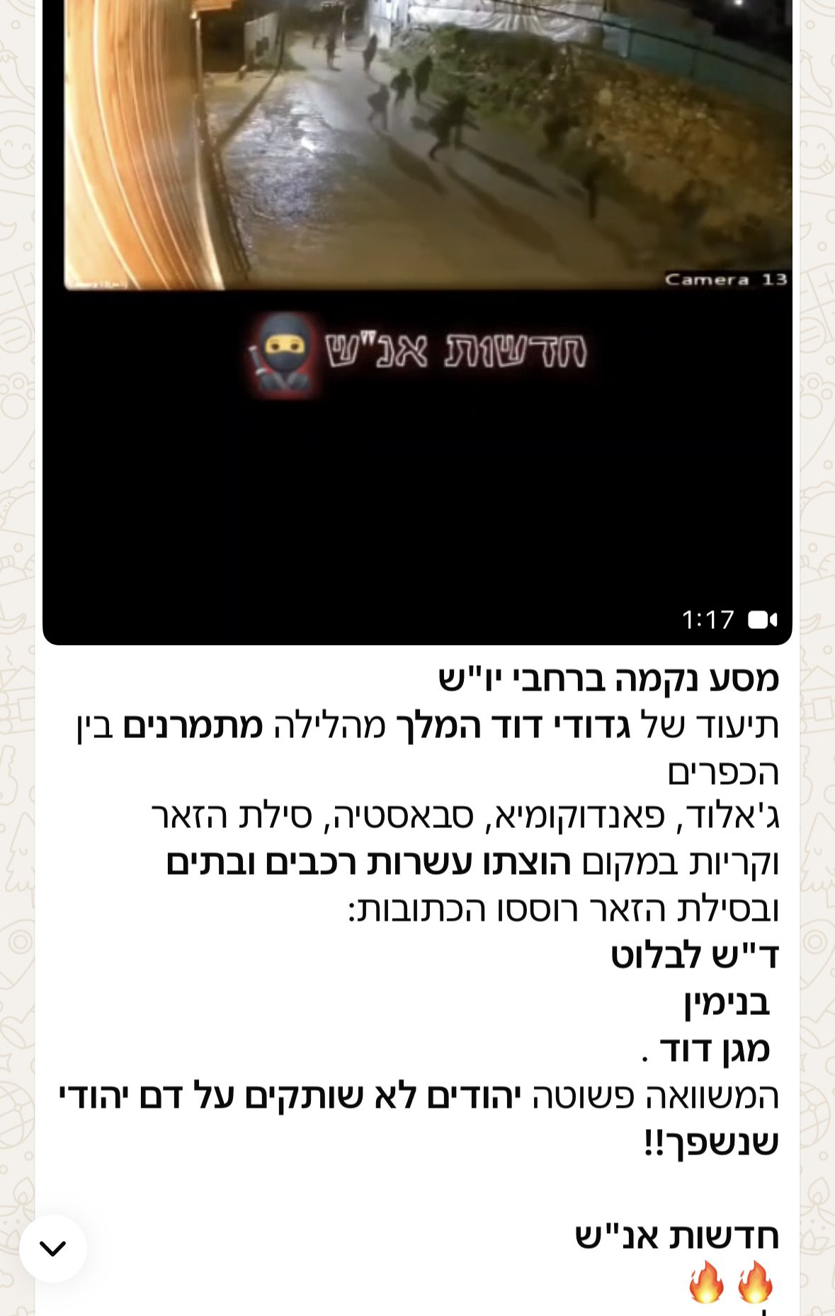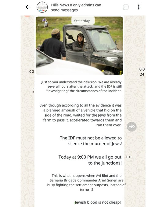 "Today at 9:00 PM we will go out to the junctions! Jewish blood is not cheap!" This is a post from March 21, 2026, evening on Hilltop News, the West Bank's Hilltop Youth WhatsApp group. Later that night at least 15 Palestinian villages were attacked by settler terrorists. It's all organized and carried out completely out in the open