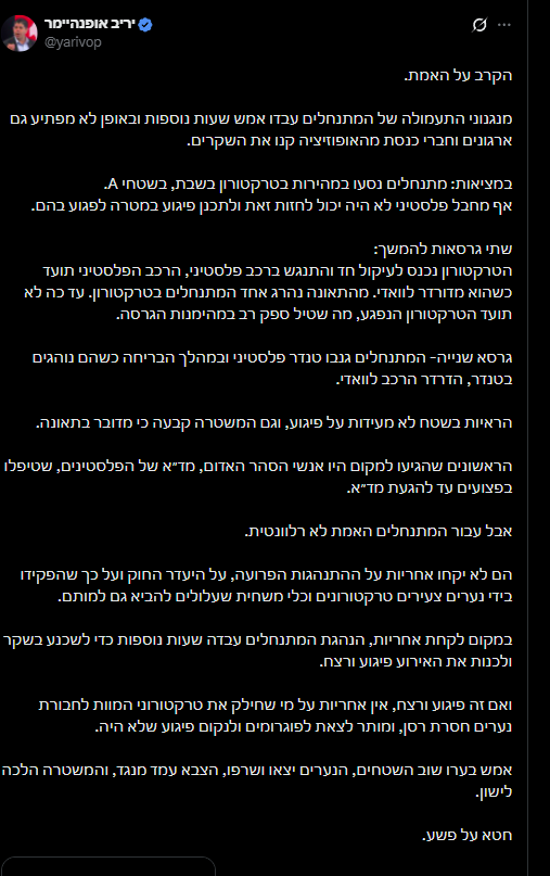 According to יריב אופנהיימר (Yariv Oppenheimer) Israeli public figure, activist, commentator, and media personality known for his involvement in peace and human rights advocacy, there are two version of this accident, both versions indicate the deaths were accidental and not caused by a Palestinian attack.