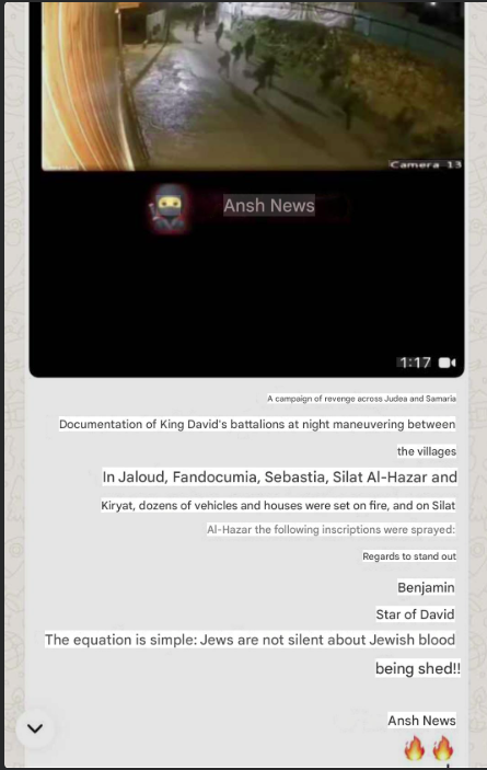 "Ansh News A campaign of revenge across Judea and Samaria Documentation of King David's battalions at night maneuvering between the villages In Jaloud, Fandocumia, Sebastia, Silat Al-Hazar and Kiryat, dozens of vehicles and houses were set on fire, and on Silat Al-Hazar the following inscriptions were sprayed: "Regards to stand out" "Benjamin" "Star of David" The equation is simple: Jews are not silent about Jewish blood being shed!! Ansh News"