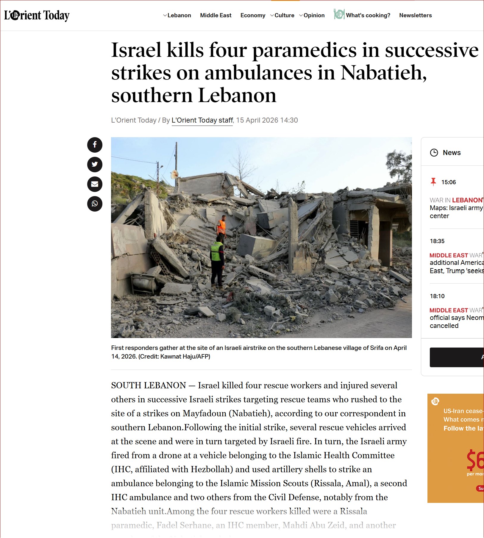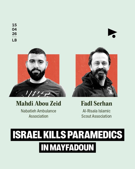 On April 15, 2026, Israel carried out a “triple tap,” killing three medical workers and wounding six, in Mayfadoun, outside of Nabatieh, Southern Lebanon. Paramedics were trying to rescue wounded from an airstrike, when they were struck. Another ambulance came to rescue the medical workers and was struck. A third rescue attempt was made, and that ambulance was struck too. A paramedic remains missing.