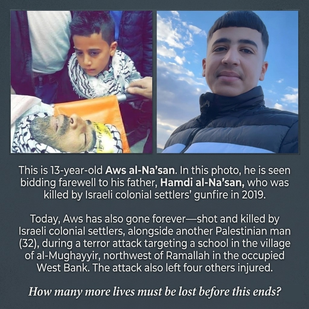 Two citizens were killed, one of them a school student, and three others were injured on Tuesday afternoon by settlers’ bullets. The student Aws Hamdi Al-Naasan (14 years old) and the young man Marzouq Abu Naim (32 years old) were shot dead, and three others were injured by live bullets.