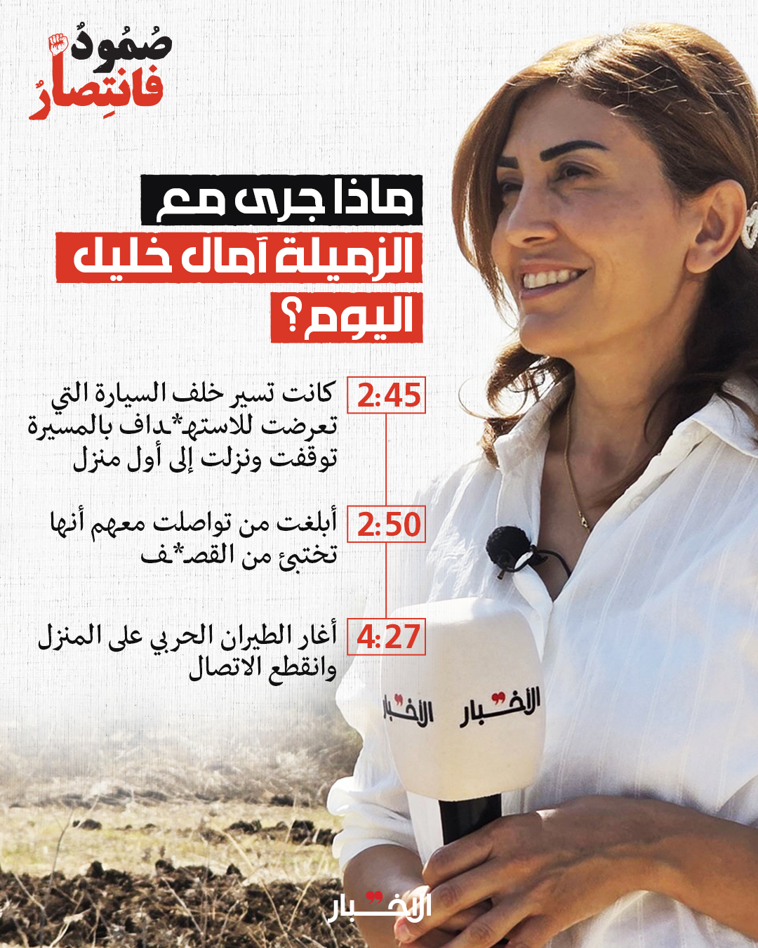 On April 22, 2026, around 14:30 and despites the "ceasefire", the Israeli a drone attacked a civilian car in the town of Al-Tiri that was accompanying the car of the two Al-Akhbar journalists, causing 2 deaths. They were in a delegate vehicle when a drone strike hit a vehicle behind them. So, the two journalists Amal Khalil and Zainab Faraj took refuge near a tree.