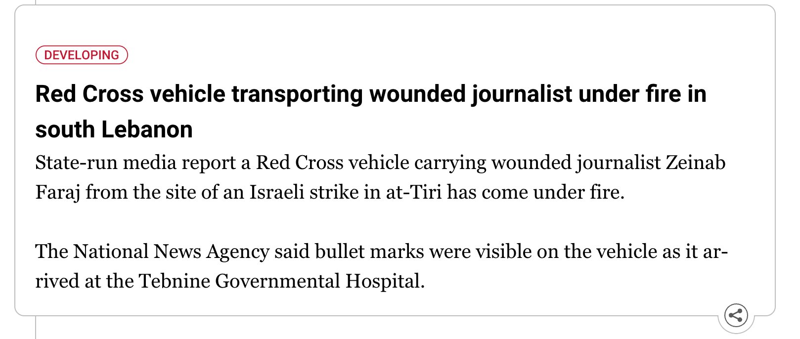 Meanwhile, RSF calls "on the international community to immediately pressure the Israeli army into allowing the rescue of Al Akhbar journalist Amal Khalil, currently trapped near Tiri in southern Lebanon following an Israeli airstrike close to her vehicle. Her life is in danger right now! Continued Israeli airstrikes are preventing rescuers from reaching her."