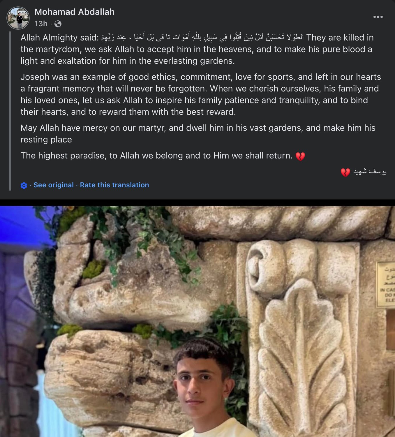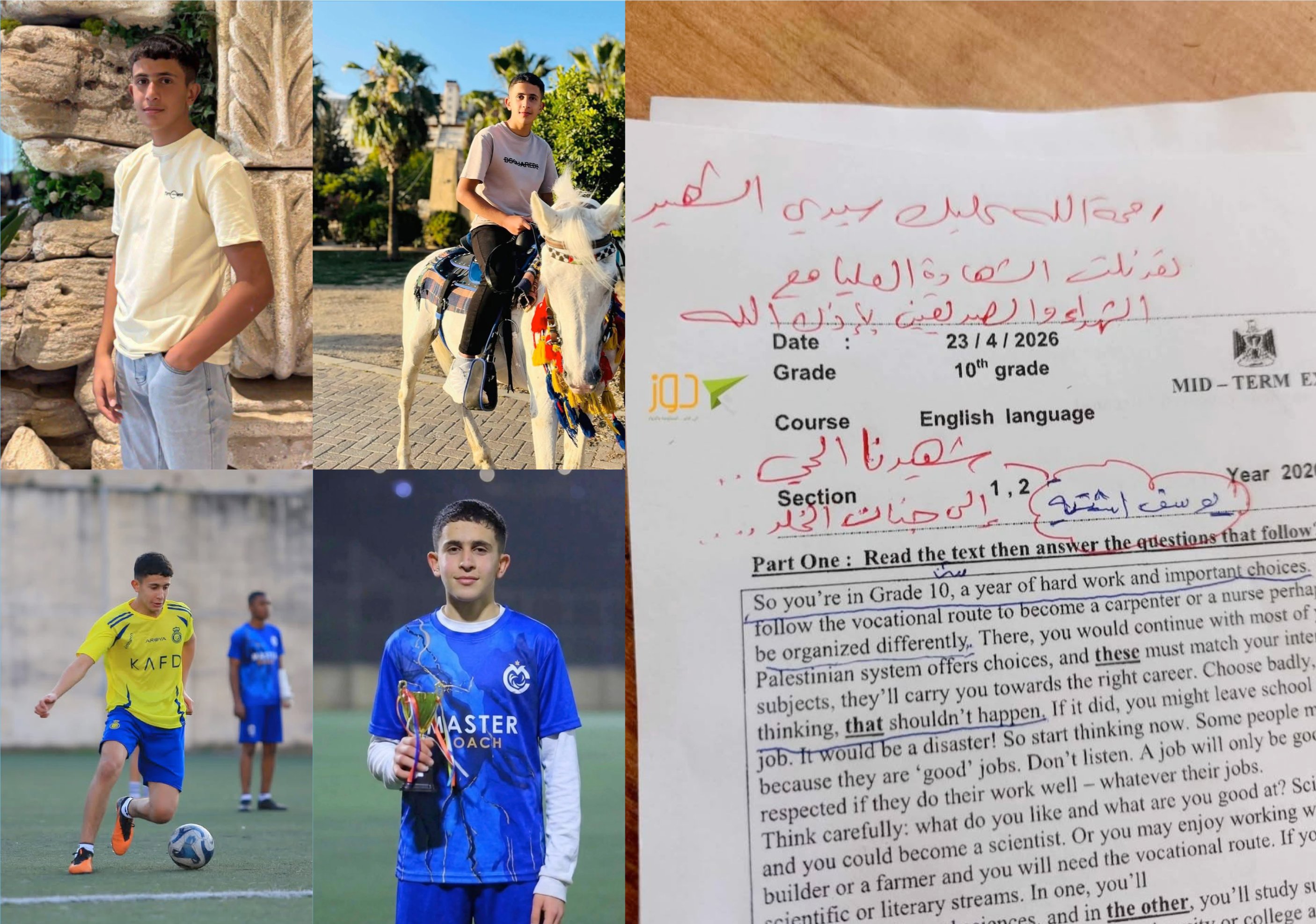 “Through your martyrdom you have attained the highest degrees. May God have mercy on you and grant you eternal peace in paradise” That’s what Teacher Ahmed Attallah wrote on the English exam his student Yousef Ishtayeh completed hours before the israeli soldiers murdered him.